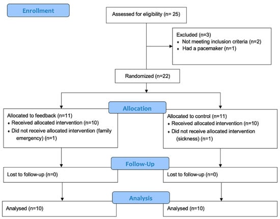 A total of 25 stroke survivors were screened for this study; 22 participants met the inclusion criteria and were successfully recruited. Half of them were randomized into the control group (no-feedback) and the other half into the feedback group. Two participants dropped out during the three weeks of intervention—one due to a family emergency and another due to sickness (Figure 4). Table 1 shows the demographic data and baseline clinical assessments. Some of the Manumeter data were lost during the intervention period:
