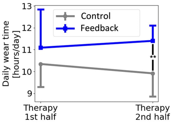 Participants in the feedback and control group wore the Manumeter for 17.2 ± 4.4 and 16.1 ± 3.9 days, respectively—a nonsignificant difference (t-test, p = 0.66). However, the feedback group wore the Manumeter significantly longer each day compared to the control group, with averages of 11.2 ± 1.3 and 10.1 ± 1.1 h/day (t-test, p = 0.005), respectively. Comparing the wear time for the two halves of the therapy period (Figure 5), we found no difference between groups for the first half (t-test, p = 0.238) but a significant difference for the second half (t-test, p = 0.002).