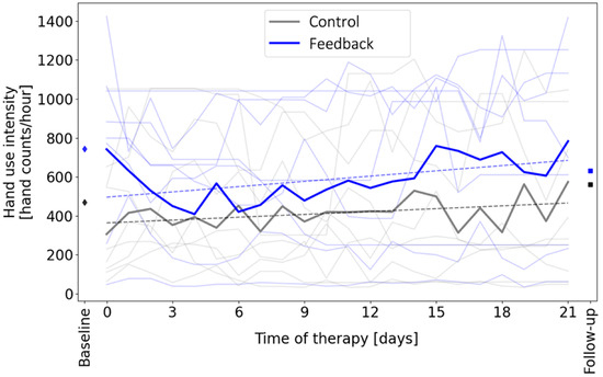 Effect of feedback on hand use intensity. The light lines show data from individuals in order to show variability within and across participants. The dark lines show the group averages. The feedback group significantly increased their hand count intensity over time (dashed line, linear regression, p = 0.012, slope = 9.0 hand counts/hour per day, which amounted to ~2000 additional counts per day by study end), while the control group did not (p = 0.059; slope = 4.87 hand counts/hour per day). The diamonds and squares show the hand use intensity measured at baseline and follow-up, respectively, when the feedback screen was turned off for all participants. Hand use intensity was not significantly different between groups on the baseline or follow-up days (t-test, p > 0.05).