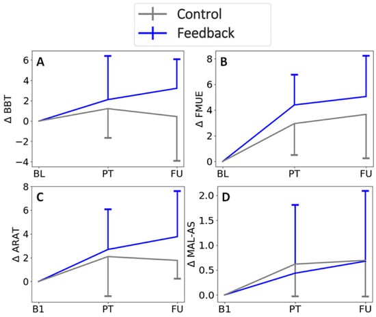 Change in clinical scores from baseline. For BBT and FMUE, B1 is the average for the scores from the two baseline assessments. Bars represent 1 standard deviation. Time points are BL = baseline, B1 = baseline 1, PT = post-therapy, FU = Follow-up. Clinical assessments are BBT = Box and Blocks Test, FMUE = Fugl-Meyer Upper Extremity Scale, ARAT = Action Research Arm Test, MAL-AS = Motor Activity Log—Amount Scale. GroupXtime interactions were not significant.