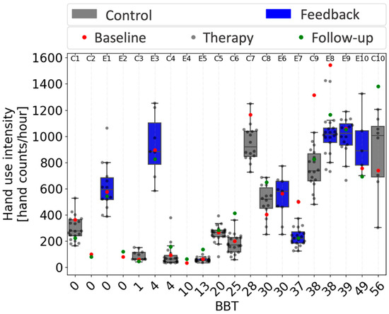 Relationship between hand use intensity and Box and Block Test (BBT) score. Each circle represents the average hourly count for one day. Participants are ordered by BBT. The box and whisker plots use bars to show the 25% and 75% percentiles of daily hand use intensity, and lines to show these quartiles plus and minus the interquartile range. Thus, the plots indicate the individual distribution of daily hand use intensity across the three weeks of therapy for participants in both groups (control in gray, feedback in blue). Box and whisker plots do not include baseline and follow-up data, which are indicated by red and green dots, respectively. Subject numbers are presented on the top, with Es for participants in the feedback group and Cs for participants in the control group. Note that the x-axis is equally spaced and not scaled to BBT score.