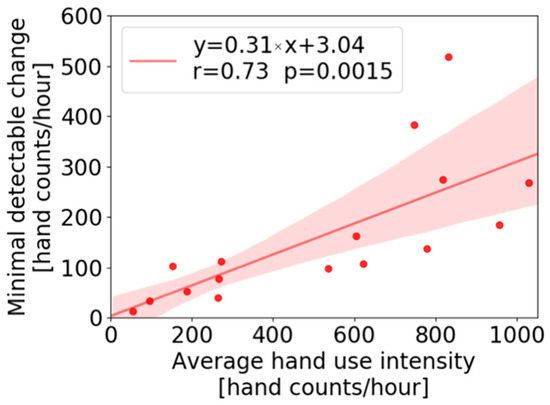 Minimal detectable change in hand use intensity that can be detected with respect to average daily intensity over three weeks of wearing, at a significance level of 0.05, plotted versus average use intensity across the three weeks of wearing. The shaded area represents the 95% confidence interval of the regression line.