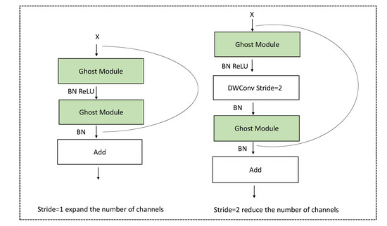 The GhostNet generates more feature maps with fewer parameters, which makes it a better option for extracting small target feature maps. In this paper, due to its efficiency, we adopted GhostNet as a backbone network instead of the traditional ResNet. GhostNet is mostly made up of Ghost bottlenecks, with Ghost modules serving as the building blocks. The first layer is a typical convolutional layer with 16 filters, followed by a sequence of Ghost bottlenecks with increasing channel counts. These Ghost bottlenecks are classified into stages based on the sizes of their input feature maps. The Ghost bottleneck can be considered as the basic residual block in ResNet, in which several convolutional layers and shortcuts are integrated. The Ghost bottleneck, as shown in Figure 1, is mostly made up of two stacked Ghost modules.
