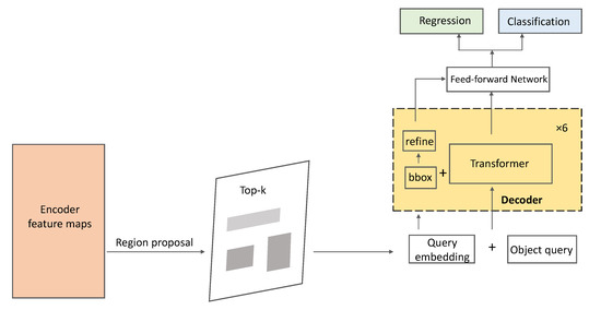 The proposed scheme had a two-stage transformer (see Figure 3) process: (a) generating region proposals at the end of the encoder layer and (b) fine-tuning object queries several times in the decoder layer.