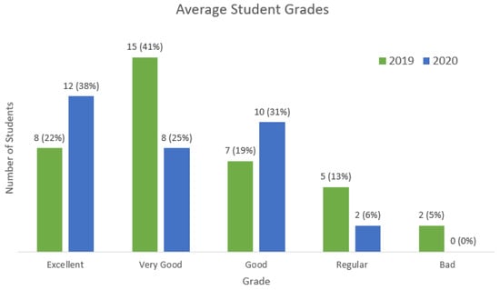 In 2020 (face-to-face), all 32 students completed the course successfully with a final grade above 5/10 (i.e., requisite for approval), with an average student grade of 8.38, maximum of 9.87, and minimum 5.17. In 2019 (remote), 35 out of 37 students completed the course, with an average student grade of 7.89, maximum 9.52, and minimum 2.81. Figure 4 presents the average student grades classified in excellent (final grade above 9), very good (between 8 and 9), good (between 7 and 8), regular (between 5 and 7), and bad (less than 5) categories.