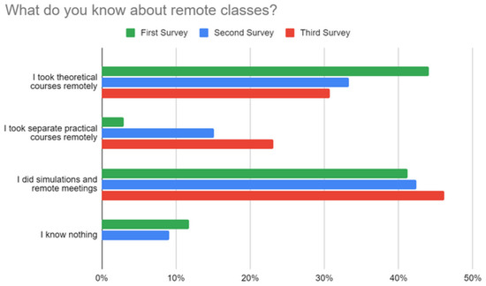 Most students took theoretical courses, and they performed simulations and meetings remotely. Only a few took practical courses remotely, which validates our initial assumption that the practical activities of these students during the pandemic were limited, as shown in Figure 5. One student stated that “LabEAD contributes to a new vision of remote classes”.
