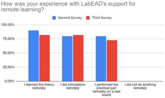 Regarding the first additional question, 82% (9 out of 11) of the students agreed that they learned the practical part of serial transmission and reception, and 91% (10 out of 11) agreed that they learned a little regarding the remote control of a servo motor. The experience with LabEAD support for remote learning was also positive, with more than 70% of participants in the intermediate and final surveys agreeing that they could not only learn the theory and run simulations but also perform practical activities remotely, on a real board, as observed in Figure 6.