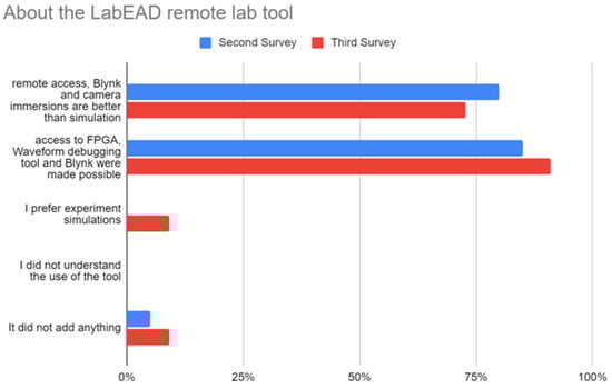 Figure 7 shows that more than 70% of the students agreed that they preferred using remote access, the Blynk IoT platform, and a camera over simulations in the second and third surveys, with only one student in the third survey stating that the tool did not add anything and that simulations were preferred in his/her perception. Although simulations are equally important, we advocate that providing a remote lab with real board deployment and the usage of an IoT system may help students acquire skills that can be useful in real-world projects, such as identifying problems, proposing, and testing solutions based on the tests performed.