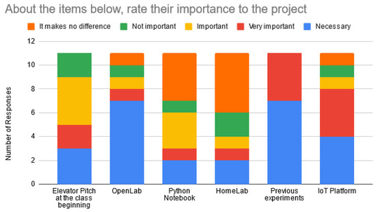 Regarding the first question, in the first survey, 10 out of 25 participants (40%) reported that they only knew the theoretical concepts of serial communication, actuators, and sensors, and the remaining 15 reported that they knew nothing (60%). In the last questionnaire, 11 participants reported that LabEAD allowed remotely learning these concepts. Previous knowledge was obtained in other theoretical disciplines, as explicitly stated in the following student comment: “I know very little, just the content covered in previous disciplines in the course”. Between the different concepts, one student said that the most relevant one was serial communication: “This knowledge is important, especially the serial, which forms the basis of communication between components”.