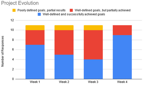 Taking into account other participants, such as professors and technical assistants, it is possible to state that all of the participants greatly improved their knowledge, especially during this pandemic period. At the beginning of the pandemic, students worked with partial project cycles, i.e., they would use simulation tools to verify their projects. Then, they executed half of a project cycle without the implementation and delivery phases.