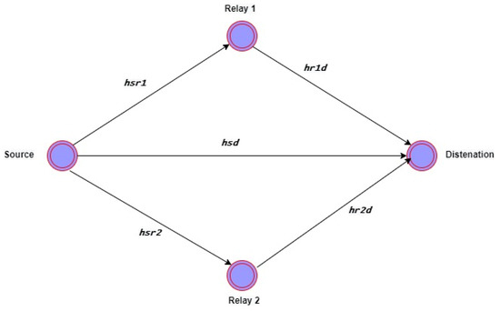 All receiver sensor nodes received the data broadcast by the source node Source. The source node follows the cooperation strategies. A simple cooperation model shows in Figure 3, where the Source, the source node, transmits the signals to relay nodes Relay1, Relay2, and the Destination. The signal received by Relay1, Relay2, and Destination is developed as [14].