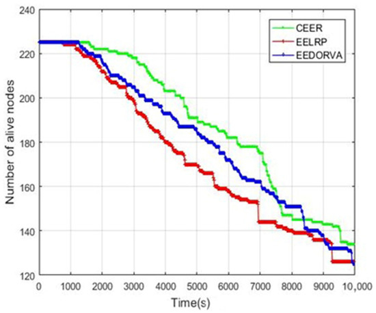 To understand a clear idea about the stability and instability periods of the proposed and current state-of-the-art routing protocols, we have decided to analyze and show the alive sensor nodes in both the proposed and existing protocols. Figure 4 illustrates that CEER is better than both the existing routing protocols. The first or initial node in the CEER dies at 1200 s, and is approximately 200 s longer than the EELRP and EEDORVA. In the EELRP and EEDORVA routing schemes, node dying starts gradually after 1000 s. CEER was found to have a more extended period of stability than the existing techniques since it was stable for much time. Compared to the EELRP, the EEDORVA is better after our proposed protocol. The figure illustrates the network’s lifetime with the proposed protocol has been enhanced by 15% approximately compared to the EEDORVA and more than 20% from the EELRP.