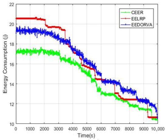 The energy consumption of the proposed and existing EELRP and EEDORVA routing protocols is shown in Figure 5. The total energy consumption of the CEER is lower than the two other schemes due to efficient data forwarding through the sink nodes. Data are forwarded directly when the sink node is in communication range to minimize energy consumption. When the sink is not in communication range, CEER selects the nearest neighbor node with maximum energy and bit error rate (BER) for data transferring to the sink node. The EELRP routing scheme gathers data in multiple steps because the authors divided the total simulation area into various segments. Each segment has its agent for data gathering and then transfers to the final destination. From the start of the simulation, CEER uses low energy compared to the other two schemes and then decreasing gradually when the time increases.