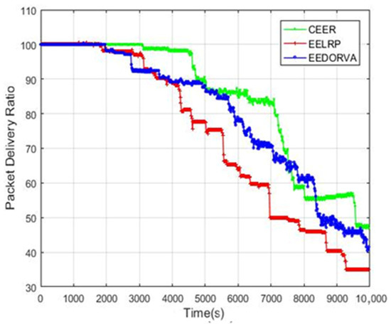 Figure 6 shows the packet delivery ratio (PDR) comparison of the CEER and the other two existing routing protocols. The graph illustrates that the CEER performs better in terms of PDR than the other two schemes. The main reason for the high PDR is focusing on lower BER, and the CEER scheme can achieve high PDR by avoiding adverse channel effects. In addition, it uses essential function variables of highest residual energy and lowest distance to select sender and destination. The CEER strategy decreases the number of participating nodes by working with direct communication between the source and destination, which uses minimal energy and keeps the nodes alive for a long time to transmit the packets. The figure illustrates that the proposed routing scheme enhanced the PDR by 20% approximately compared to the EEDORVA and more than 25% compared to the EELRP.