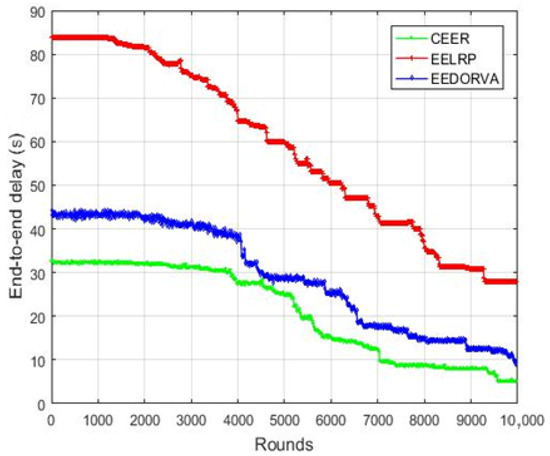 The end-to-end delay of the proposed and existing routing protocols is plotted in Figure 7. As shown in the figure, the delay of the proposed scheme is lower than all other schemes because of the lower distance between the sensor and sink node. The high delay in EELRP is to transfer data from multiple stages and not directly sent to the base station. As illustrated in the graph, the EEDORVA performs better than the EELRP because the EEDORVA transfer data to the base station using simple depth value selection. The figure demonstrates that the proposed routing scheme enhanced the end-to-end delay by 200% approximately compared to the EELRP and more than 25% compared to the EEDORVA.