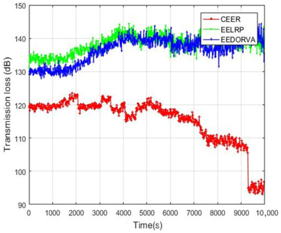 The transmission loss of the proposed CEER and the EELRP and EEDORVA schemes is plotted in Figure 8. As illustrated in the graph, using the multiple cooperative nodes is very effective in the CEER compared to the EELRP and EEDORVA noncooperative techniques.