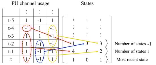 Before presenting the proposed scheme, we briefly introduce the basic idea of the existing Q-learning and DQN based spectrum access methods. The Q-Learning based spectrum access method uses the channel usage status at current time slot t of different PUs as the states for learning. An illustrative example with 3 PUs is shown in Figure 1a. If at time slot t, the status of channels are busy, busy and idle, respectively, the states will be recorded by vector . The action will be the index of the channel that SU intends to access at next time slot . For instance, indicates that SU will access channel at next time slot. If the channel that SU intends to access at time slot is idle, the spectrum secondary use succeeds and the system’s total spectral utilization ratio improves. Otherwise, if the channel that SU accesses at time slot is busy, the channel access fails since the interference occurs. The cost value is defined as 0 if the channel access succeeds, or 1 otherwise.