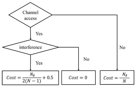 Here, and N denote the numbers of idle channels and total channels, respectively. could be easily derived by measuring the total received power. Notice that is required only when the SU does not access the channel or it has to refrain from accessing due to interference occurring. Specifically, if SU chooses the no access action, the cost value will increase in proportion to the number of idle channels. If SU chooses to access the channel k, and unfortunately interference occurs, the cost will proportionally increase with the number of idle channels in the range . Finally, if SU chooses to access the channel k, and channel k is idle, then the cost will be 0. A flowchart to illustrate the proposed status aware cost function design is given by Figure 3.