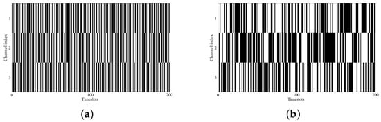 In the simulation, we considered a typical interweave cognitive radio network with multiple PUs and single SU. Regarding the PU channels, both the traditional correlated channels and extremely challenging uncorrelated channels are considered. Various DCs and complexities for the PU channel usages are adopted. The DC varies in range . For each DC, nine patterns of data with different complexities are used, and the complexity is measured by entropy rate that given by Equation (1). The entropy rates for each DC are shown in Table 1. From pattern to pattern , the complexities gradually increase. An example of the PU channel usages for DC = 0.5 with pattern and pattern are illustrated in Figure 4. It is obvious that the channel usage pattern with low complexity is much easier to predict compared with pattern .