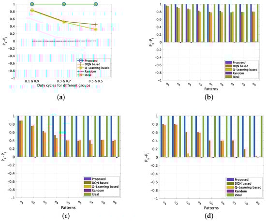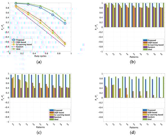 for correlated PU channels (No. of PU = 10). (a) Different DCs for groups and . (b) Different patterns when DC() = 0.1 and DC() = 0.9. (c) Different patterns when DC() = 0.3 and DC() = 0.7. (d) Different patterns when DC() = 0.5 and DC() = 0.5.