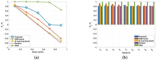 First, Figure 5a illustrates the results of for different DC combinations. It is obvious that the ideal results are always 1, since the channel access success probability is and the SU-PU interference probability is . The random channel access method could only achieve , since its channel access success probability and SU-PU interference probability are both . For the proposed method, it could achieve almost the same performance as the ideal results for all three duty cycle combinations, which indicates that both the time correlation and channel correlation of the PU channels are well learned. On the other hand, the performance of two existing methods, i.e., the Q-learning based method and the DQN-based method, varies from to at different duty cycle combinations, and the DQN-based methods performs slightly better than Q-learning based method.