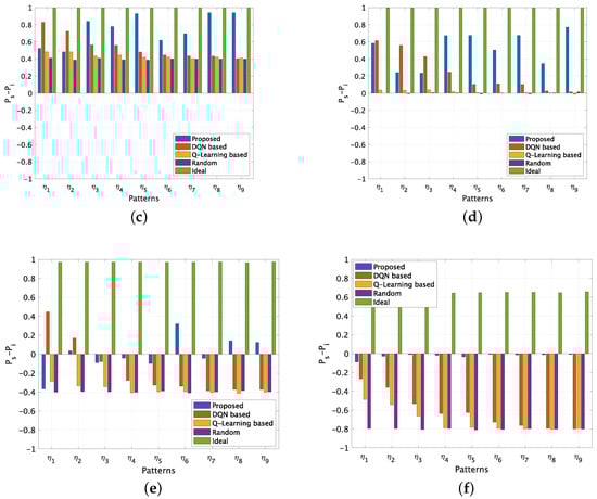 Figure 6b–f show the results of at different DC by varying the complexities of the PU channel usage patterns. As expected, the ideal results and the performance of random channel access method keep constant regardless of the complexities. On the other hand, the performance of the two existing methods degrades as the PU’s channel usage complexity increases. This performance variation becomes large when the DC increases. For the high DC and high complexity cases, i.e., when and when , their performance degrades to the same level as the random channel access method, which indicates that the learning has failed and the prediction results are not helpful. It is confirmed that the proposed scheme keeps a constant gap to the ideal results at all DCs for all the patterns with different complexities. The performance of the proposed scheme is not affected by the complexities. It performs well even in very challenging scenarios with high DC and high complexity.