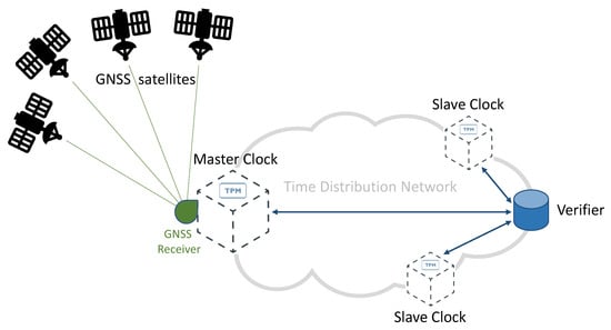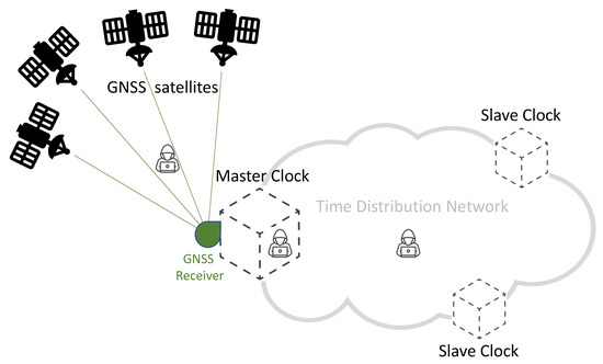 In the recent scientific literature, several categories of attacks have been analyzed, with particular regard to those against the GNSS Radio-Frequency spectrum and the timing protocols over the network, and appropriate countermeasures have been proposed (e.g., refer to [6,7,8] and references therein). In Trusted GNSS-Based Time Synchronization for Industry 4.0 Applications [9], the authors analyzed the attacks that compromise the integrity of software and configurations in the nodes involved in the synchronization distribution network and proposed a framework to monitor the integrity of nodes and detect tampering with them.