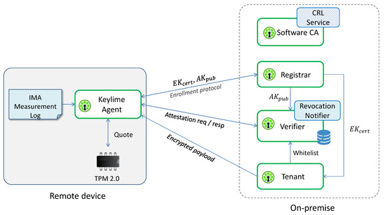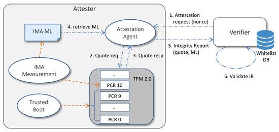 Among the various types of remote attestation that can be implemented, in this paper, we will consider an explicit attestation based on TPM 2.0 [31]. The Attester platform must be equipped with a TPM 2.0 chip, which provides an EK key with the corresponding certificate issued by the TPM manufacturer, representing the root of the chain of trust for the attestation keys (AKs). To enable RA, the Attestation Agent running on the remote platform must have the right permissions to use an AK, which can be either the Initial Attestation Key (IAK) certified by the platform manufacturer to create a binding with the identity of the device, or a Local Attestation Key (LAK), generated by the owner or administrator of the device. The Verifier has to acquire the AK certificate either through a Privacy Certificate Authority (CA) or the platform itself; moreover, it has to be able to access the reference whitelist of the attesting system. The whitelist is the set of known-good values, which are compared with the platform’s integrity measurements during the attestation process; it is provided and validated through certificates by the platform manufacturer and the software vendor, or it is generated by the system administrator, in an isolated environment the first time the platform is booted.