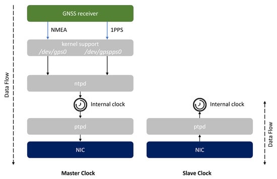 The integrity of the PTP protocol depends on the integrity of all software components, present on the nodes of the network, which affect its correct operation. Figure 4 represents a possible software stack and configuration applied to Master Clock and Slave Clock nodes.