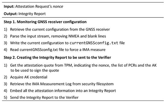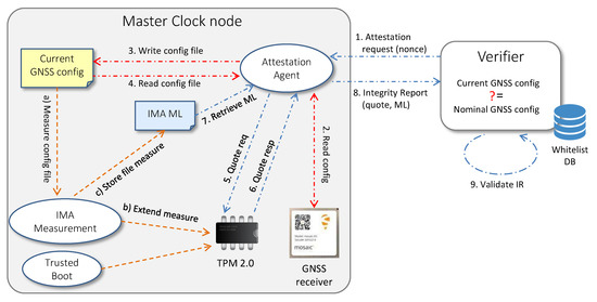 Figure 6 depicts the new attestation workflow. When the Attestation Agent receives an attestation request from the Verifier, it retrieves the current configuration from the GNSS receiver and parses the information read by the interface so that data acquires a well-established integrity semantics. Afterwards, the Attestation Agent writes the parsed configuration in the currentGNSSconfig.txt file and re-reads the same file to trigger a new measurement event in the IMA module. This process will produce a new entry in the IMA ML if the file has not yet been measured or its digest has changed from the previous measurements due to a manipulation of the receiver configuration. In this way, a Verifier is able to detect a violation that occurs in the configuration of the GNSS receiver by comparing the measure present in the IMA ML with a nominal measure, corresponding to the expected configuration previously inserted in the certified whitelist. To carry on the remaining process, the Attestation Agent creates an IR containing the TPM quote, the IMA ML and the AK credential, as described in Section 4.4, and sends the IR to the Verifier. The latter is now able to attest both the entire software stack of the Master Clock and the GNSS receiver configuration. Figure 7 summarizes all the steps performed by the Attestation Agent on the Master Clock node.