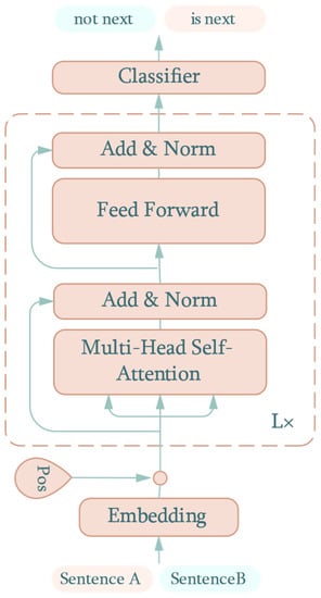 Bidirectional Encoder Representation from Transformer (BERT) is a state-of-the-art method of extracting features from natural language by utilizing the encoder structure from the transformer []. With the idea of embedding bidirectional context information, BERT has been shown to achieve remarkable results on 11 different natural language processing tasks. A summary of the BERT structure for next sentence prediction is show in Figure 1.