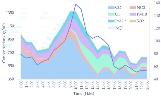 After processing abnormal values and converting the wind parameters, data previews were performed. As shown in Figure 2, the left axis measures the concentration of each pollutant at 1 July 2021 in the form of the stacked area and the right axis denotes the calculated AQI. More specifically, CO has the greatest stacked area, which means that it comprises the highest content of these pollutants. It can be seen that the concentration of pollutants varies considerably and CO is several orders of magnitude higher than SO2, which is the pollutant of minimum proportion.