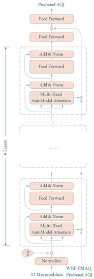 On the basis of the BERT structure, we propose an end-to-end Auto-Modal network with pure encoders, which predicts the AQI directly instead of calculating the AQI on the basis of predicted airborne substances individually. Figure 3 shows the structure of the proposed model for predicting the AQI, which is a model with bidirectional time-series inputs. One of the time-series inputs of the proposed model is the historical measured meteorological parameters and pollutants which determine the AQI. The other time-series input is the AQI, which is calculated with the six pollutants used for prediction in the WRF-CMAQ model, and it is a baseline value to improve the prediction accuracy and increase the generalization ability of the proposed model.