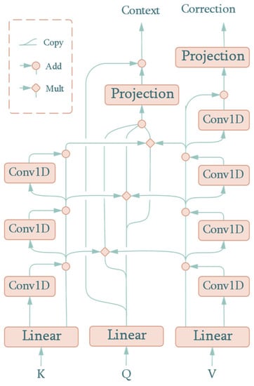 where and are the weights of the two linear layers. It should be noted that the correction output is calculated based on because the convolution in the key-decomposition and value-decomposition components share weights in the corresponding layers. This means that is the kernel of both the th convolution of values and the keys for that input of values are exactly the keys in the self-attention, with no need to update the weights repeatedly. It is obvious that acts only on the value-decomposition component; thus, it is responsible for learning the feature of the correction value.