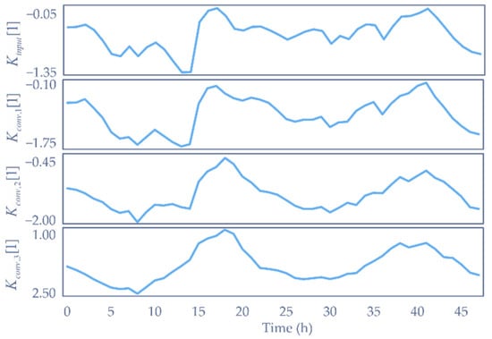 where is the kernel of the th depthwise convolution, is the sum of the th depthwise convolution and its input, and is the input key of the attention mechanism. In order to illustrate the effect of our network more clearly, the input and output of the key decomposition component are plotted in Figure 5. represents the th column vector from . Therefore, the first plot is the input signal intensity along with the time sequence, with the following three plots denoting the intuited decomposed values. The p-values of min-max normalized from an augmented Dickey–Fuller test are 0.0155, 0.0049, 0.0005, and 0.0002. They show that the deeper the time-series inputs go, the smoother and more stable the signal curve is, which means that more useful information concerned with time changing is extracted from the raw input, i.e., each consists of time sequences with modals for details of different scales. All the convolutional kernels extracting these modals are learned automatically when trained. Therefore, the whole structure is named the auto-modal attention mechanism. Similarly, values are processed in the same way except that one more convolution is performed.