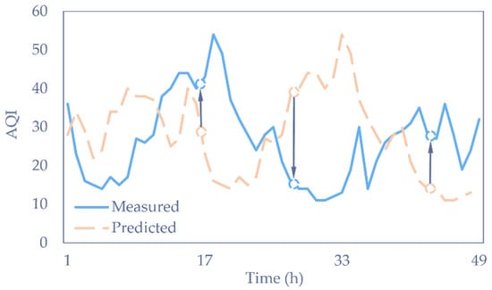 where, is the AQI calculated from the measured pollutants at the current moment and represents data at 8, 16, 24, 32, 40, or 48 h in the future, depending on the specific experiment. We used the Relative Forecast Power (RFP) to assess the performance related to a baseline model: