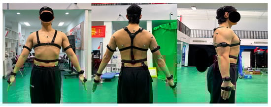 Upper-body kinematics were collected simultaneously at 100 Hz by the PNS and the OptiTrack with 10 high-speed cameras. Eleven IMUs (15.5 g; 43 × 33 × 20 mm) and twenty-five reflective markers (diameter of 14 mm) were placed on the participants’ body parts as shown in Figure 1. In accordance with the recommendations of the manufacturer [22], the PNS IMUs were placed on the back of the head, shoulders (upper portion of the scapula), upper spine, lower spine (just above the hips), upper arms (above the lateral elbow), and forearms (just above the lateral side of the wrist). A three-axis accelerometer (32 g), a three-axis gyroscope (2000 DPS), and a three-axis magnetometer were included in each IMU. Reflective markers were affixed to anatomical landmarks with medical pressure-sensitive adhesive tape, and the position of these reflective markers was independent of the positions of the IMUs. Based on the OptiTrack baseline upper-body marker sets [23], the reflective markers were made to be used in OpenSim (Stanford University, Stanford, CA, USA, version 4.3) [24].