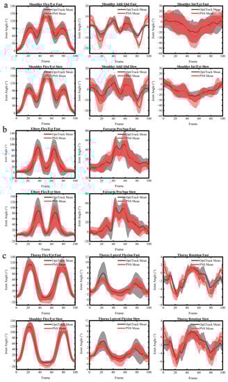 Comparison of the PNS and OptiTrack’s mean angular curves during simple tasks. (a–c) The mean angular curves of the shoulder (a), elbow (b), and trunk (c). The thick solid lines represents the mean angular curve for the PNS (red) and OptitTrack (black), and the shadow area represents standard deviations from the mean angular curve.