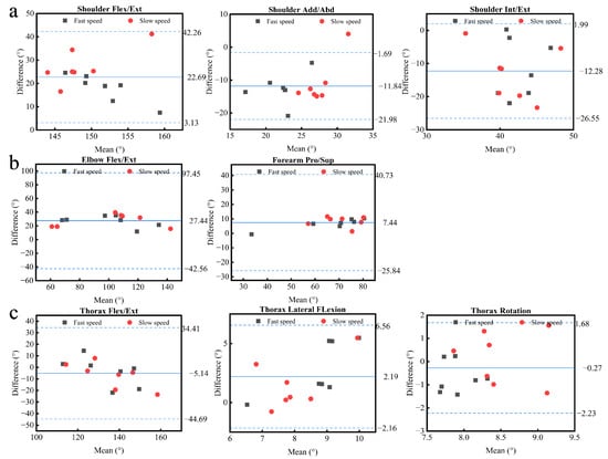 Bland–Altman plots for each absolute angular of the shoulder (a), elbow (b), and trunk (c) in simple tasks. The solid blue horizontal line stands for the mean bias, while the dashed blue horizontal lines indicate the upper and lower 95% confidence intervals.