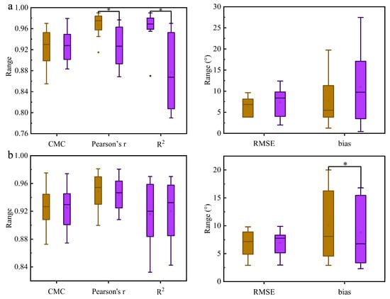 Box-and-whisker plots of the validity metrics (i.e., CMC, Pearson‘s r, RMSE, and bias). (a) simple (brown) and complex (purple) tasks. (b) Fast (brown) and slow (purple) speeds. Note that ∗ represents .
