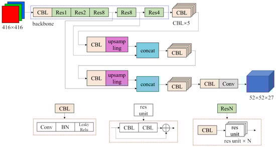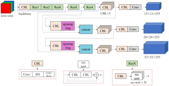 The main method used in our work is the YOLOv3 algorithm. The structure of the original YOLOv3 network is shown in Figure 1.