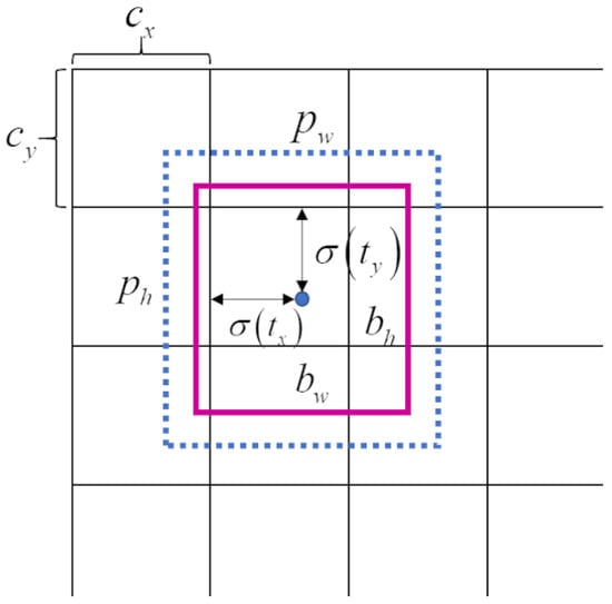 Each grid can predict 3 bounding boxes. Each bounding box has 4 coordinates t x , t y , t w , t h , which are predicted by the network. Figure 2 and Equations (1)–(4) illustrate the relationship between t x , t y , t w , t h and the width, height, and centroid coordinates of the bounding box. Where b x , b y are coordinates of the bounding box centroid, b w , b h are the width and height of the bounding box, respectively. p w , p h are the prior width and height of the bounding box that is the anchor size. The three feature maps have different receptive fields, so they are responsible for detecting objects of different scales. As a result, the anchor corresponding to each feature map should be different. For each feature map, each grid predicts 3 bounding boxes, so there should be 3 different anchors. Therefore, there are 9 different anchors in total. In original YOLOv3, they are ( 10 × 13 ) , ( 16 × 30 ) , ( 33 × 23 ) , ( 30 × 61 ) , ( 62 × 45 ) , ( 59 × 119 ) , ( 116 × 90 ) , ( 156 × 198 ) , and ( 373 × 326 ) . The corresponding relationship between them and the 3 feature maps is shown in Table 1.