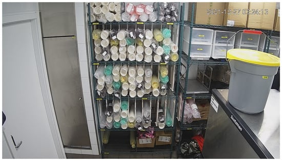 Figure 4 above is one of the images in the training set. It is a photo of the warehouse taken by a camera on the roof. In the middle of the picture, there is a shelf on which there are five kinds of cups in total, wrapped in plastic bags of different colors, named as white, green, transparent, black, and yellow, respectively, as shown in Figure 5 and Table 3. A pile of wrapped cups is detected as one object. Under normal circumstances, the shelf and camera are both fixed.