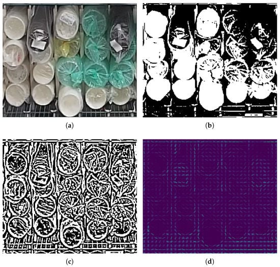 At first, we used traditional algorithms to extract features from the input images. In order to show the features more clearly, we cropped and enlarged a part of the original image, as shown in Figure 6a, which contains 4 classes of cups. In Figure 6b,c show the results of image binarization with the Otsu global threshold [15] and adaptive threshold, respectively. Picture (d) shows the features extracted by the HOG (Histogram of Oriented Gradient) algorithm [16]. Those methods are used a lot in traditional object-detection algorithms, but they have a common characteristic that the color information of input images is lost. There is a label on the black cup, and the wrapping paper of the white cup is less wrinkled. As a result, black and white cups can be distinguished by textural features, but green and yellow cups are almost same in those feature maps. Those feature maps may not be conducive to the classification of the cups. So we turned our attention to the deep learning method.