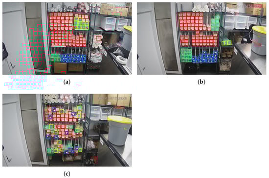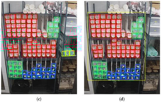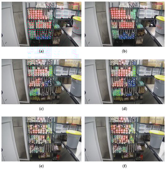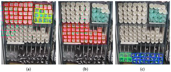During detection, we set the confidence threshold as 0.6 and the NMS IOU threshold as 0.3. The detection results are shown in Figure 11. Our detection area should be the middle 3 layers of the shelf in the middle of the picture. A white cup in picture (a) and 3 green cups in picture (b) on the right of the shelf are detected and counted, but they are outside the detection area. In picture (c), 4 black cups are missed, and a green cup in the middle layer is wrongly detected as a transparent cup. Table 4 shows the details of the detection results. The error number and error rate are calculated according to the following Equations (10) and (11).
