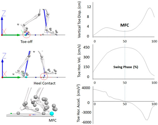 Falls are a major cause of serious injury during locomotion, particularly for populations with impaired gait function. Approximately one in three people over 65 years fall annually, and 9–20% of cases are associated with critical injuries [1,2]. Pathological populations have an even higher risk of falls; for example, 50% of stroke survivors and 68% of Parkinson’s patients fall at least once a year [3,4]. The leading cause of falls is tripping, accounting for up to 53% of cases [5,6]. Tripping can be defined biomechanically as unanticipated foot contact with the walking surface, or an object on it, generating an impact sufficient to destabilise the walker [7]. Minimum Foot Clearance (MFC) is the gait event at which tripping risk is greatest [8] and, as shown in Figure 1 (right), MFC can be identified by computing the vertical position of the swing foot (i.e., the toe) relative to the floor using 3D motion capture data [9].