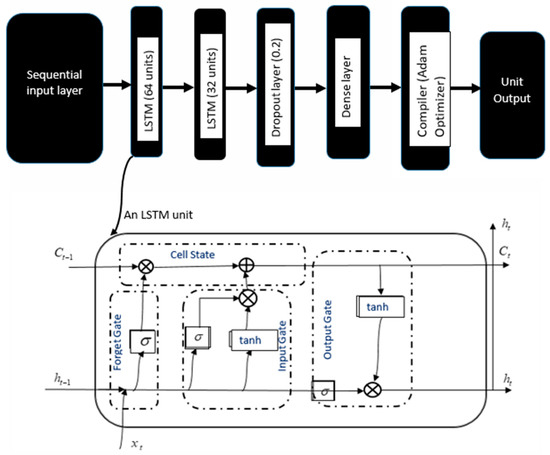 LSTM architecture with two LSTM layers (64 and 32 units each) stacked together followed by a drop-out layer to avoid overfitting, a dense layer, and a compiler. Below it is a representation of a unit LSTM architecture consisting of Forget gate to decide what must be removed from the () state, the Input gate to write from present input to current cell state, and the Output gate to decide what to output from cell state using the sigmoid function. The outputs of the Input and Forget Gate are summed together to determine each current Cell State.