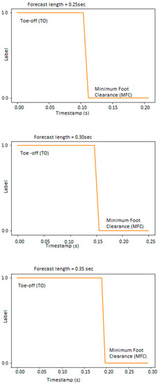 When the training algorithm model employed 50 prior observations, the predictions obtained from 0.25 s to 0.35 s were consistent with previous studies reporting that the interval between toe-off and MFC for healthy young adults is typically 0.2 s [22,23]. The MFC timing forecast began 0.15 s after toe-off, peaked after 0.2 s, and gradually diminished as the forecast horizon increased (Figure 5). In summary, the results showed that MFC timing forecasts relative to toe-off were unreliable beyond the hypothesised 0.35 s upper boundary and the current algorithm functioned with acceptable accuracy within the typical 0.25–0.35 s between toe-off and MFC.