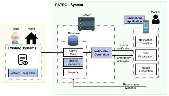 The overall system can be further divided into four sections: activity recognition, monitor generation, notification generation, and smartphone application, as highlighted in Figure 1. In this research, we focus mainly on the two sections: notification generation and smartphone application. We will now discuss each of the sections and their application in our overall system.