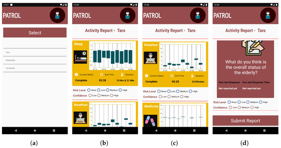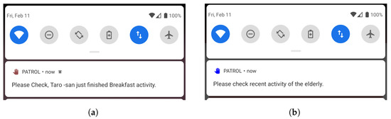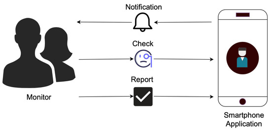 Even though recent technologies have been designed and developed targeting with an average young user in mind, who is efficient at handling new systems or devices [54,55], we have tried to make the interface simple and intuitive so that it can be used by people of all ages conveniently. As shown in Figure 2, the number of tasks to be carried out by the Monitor in the application are very minimal. Therefore, we believe that the application will be easy to use, and the burden of using the application will be low for the Monitors. Our final goal is to achieve remote elderly care and prompt identification of risky situations; however, we believe that to achieve them, the design and interface of the application should be favorable to the monitors. We aim for our concern of providing a continuous and detailed elderly care system, and an easy and intuitive interface for monitors does not remain mutually exclusive. The actions in the application to be carried out are: respond to notifications, check activity, and submit a report. Below, we will explain different features in the interface of the smartphone application, and the notification strategy that we developed.